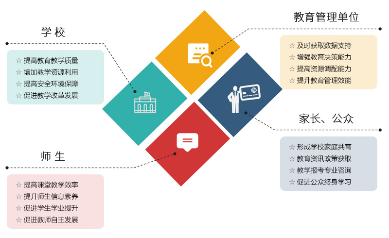 物聯網能耗管理系統 | 體質健康系統 | 教師發展檔案 | 網上評教系統 | 網絡監控管理系統 | 數字學校 | 移動辦公平臺 | 人事管理系統 | 德育考評系統 | 行政辦公平臺 | 統一信息門戶平臺 | 統一身份認證平臺 | 統一數據中心 | 平臺智能排課系統 | 學生成長平臺 | 資產管理系統 | 資源庫系統 | 數據標準與數據規范 | 校園門戶網站 | 家校互動系統 | 考務管理系統 | 題庫系統 | 綜合素質評價 | 即時通訊系統 | 評課系統 | 問卷調查系統 | 校本選課系統 | 網上閱卷系統 | 成績分析系統 | 校園GIS地理信息系統